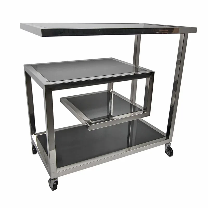 This elegant and practical bar cart from the Payaa brand is the perfect addition to your interior. Measuring 420x830x780, this bar cart is spacious enough to store all your drinks and accessories. The product number is 110810, making it easy to order and receive the correct variant. The bar cart is designed in a classic style and has a rectangular shape, making it fit seamlessly into different interior styles. The material is high quality metal and glass, which provides durability and a modern touch. The silver and black colors give the bar cart a luxurious look.